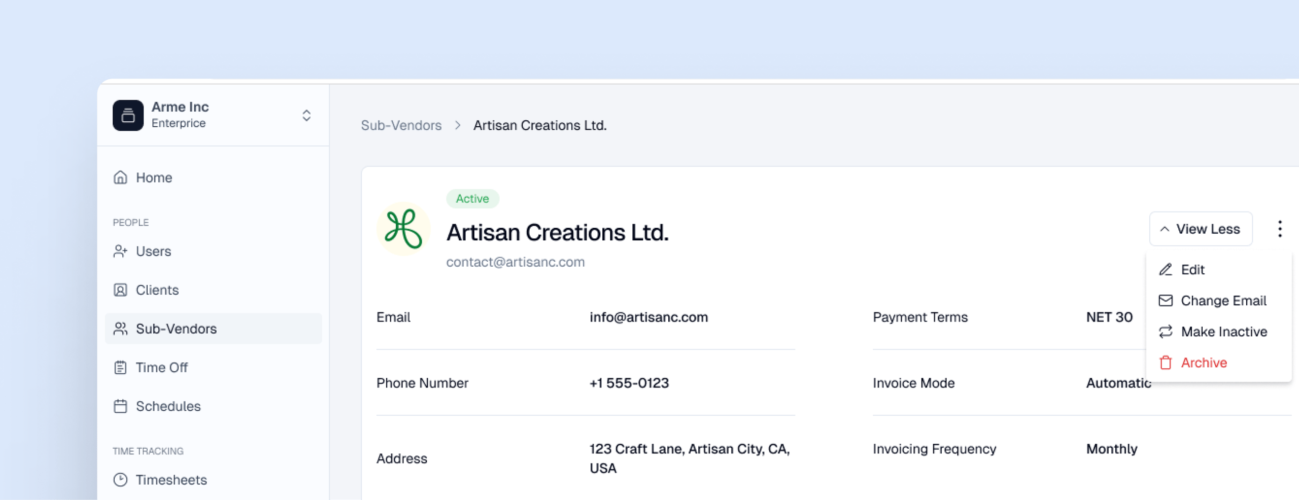 Edit client information when you want to — additional emails, payment terms, invoicing mode, schedule etc.