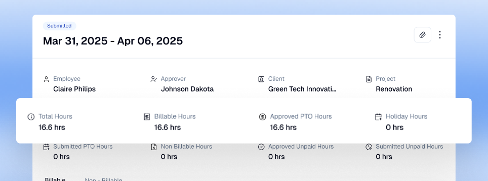 - Approved hours automatically flow into client invoices based on schedule