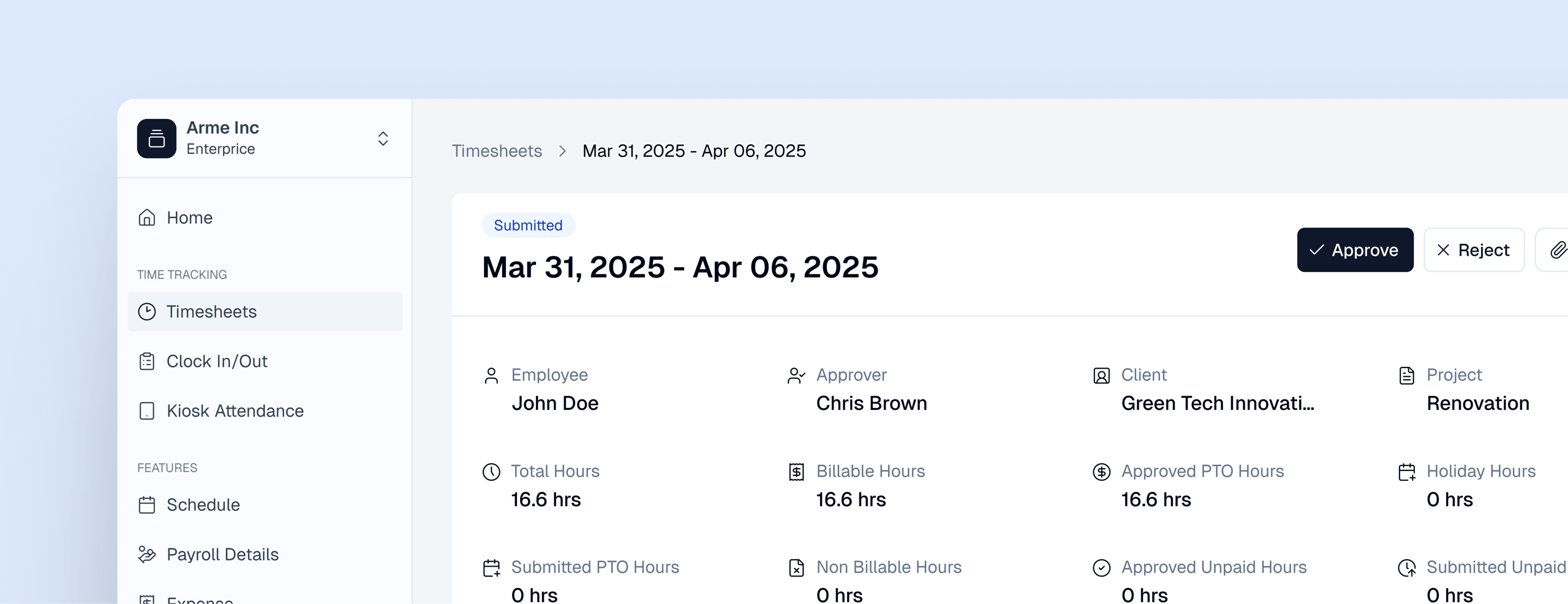 Move to next pending timesheet in one click—batch reviewing fast and focused