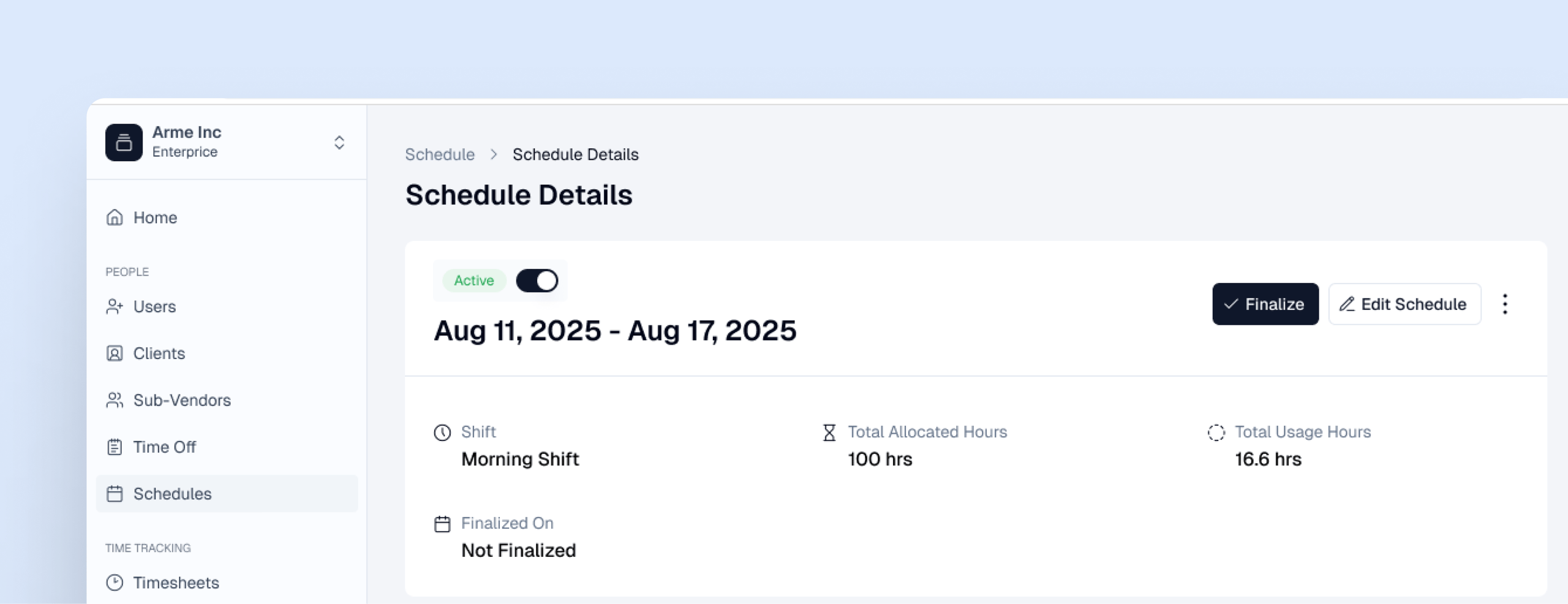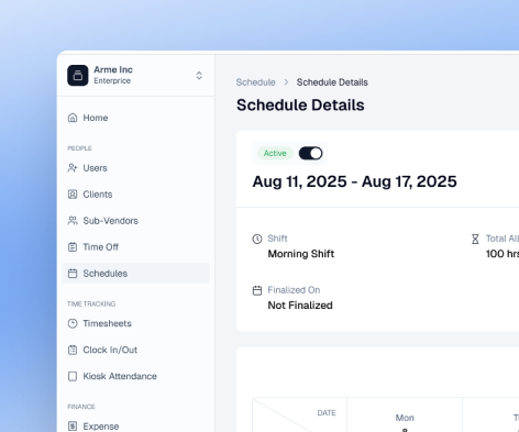 Employees view schedule, then submit timesheets or clock in/out based on scheduled hours