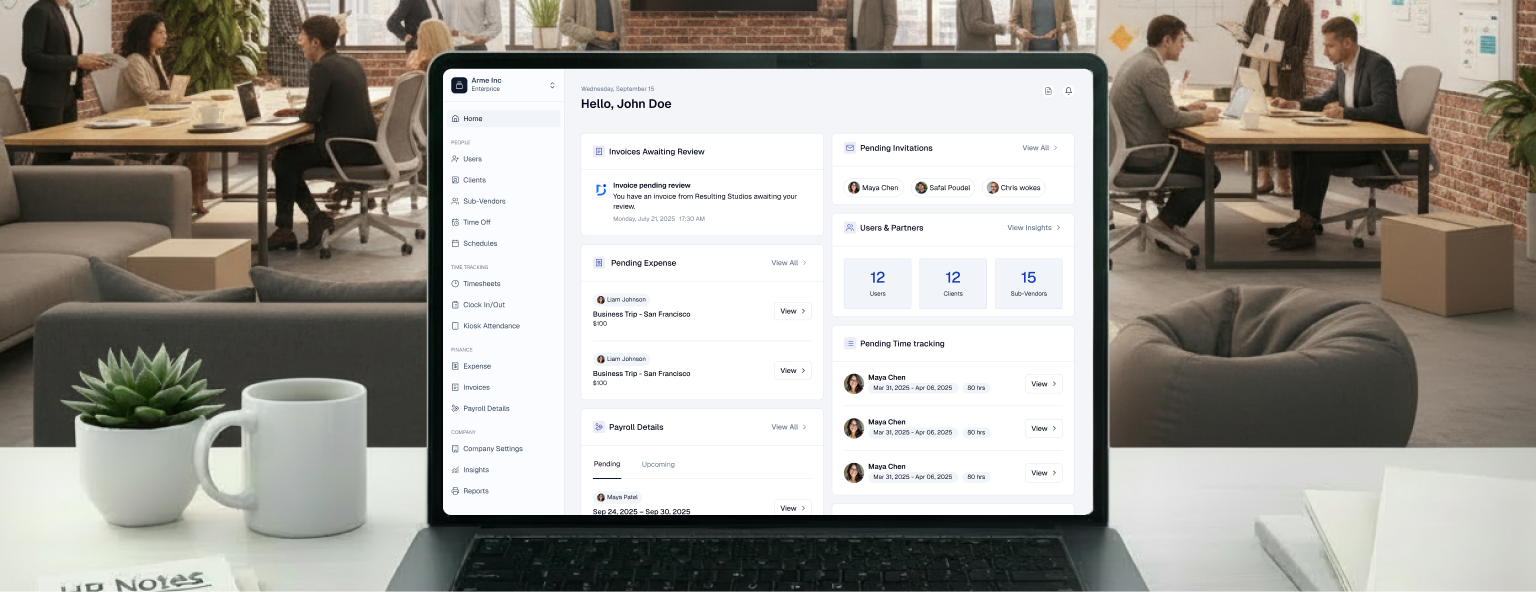 User invitations, schedule finalization, timesheet approvals, invoice updates, expense decisions